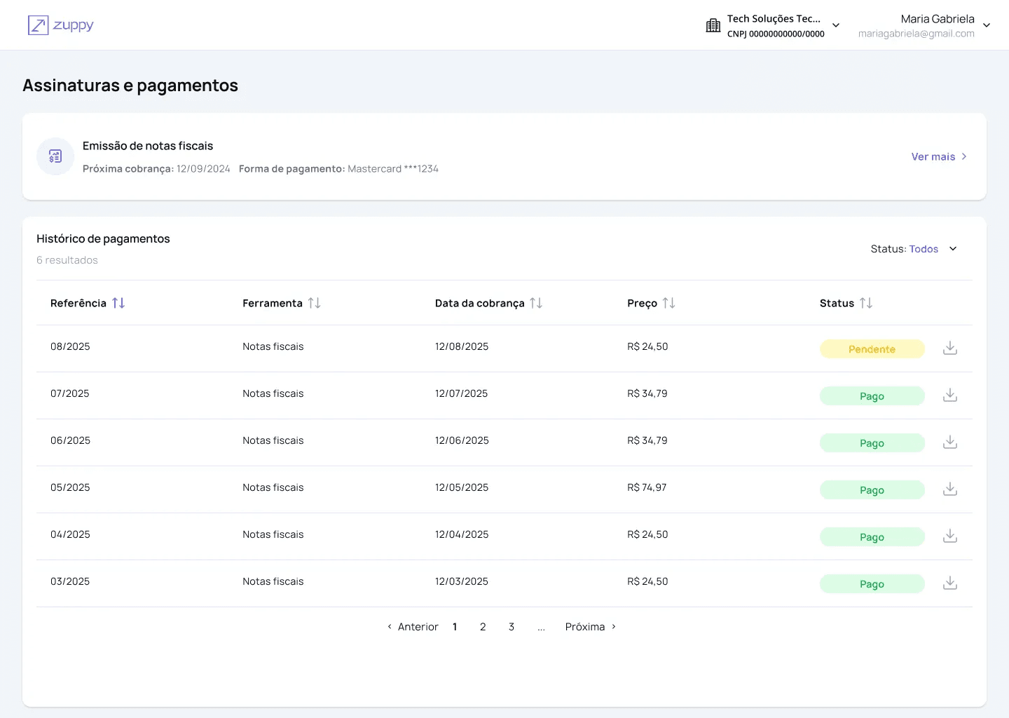 Histórico de faturas: mês, data da cobrança, total de notas e valor pago