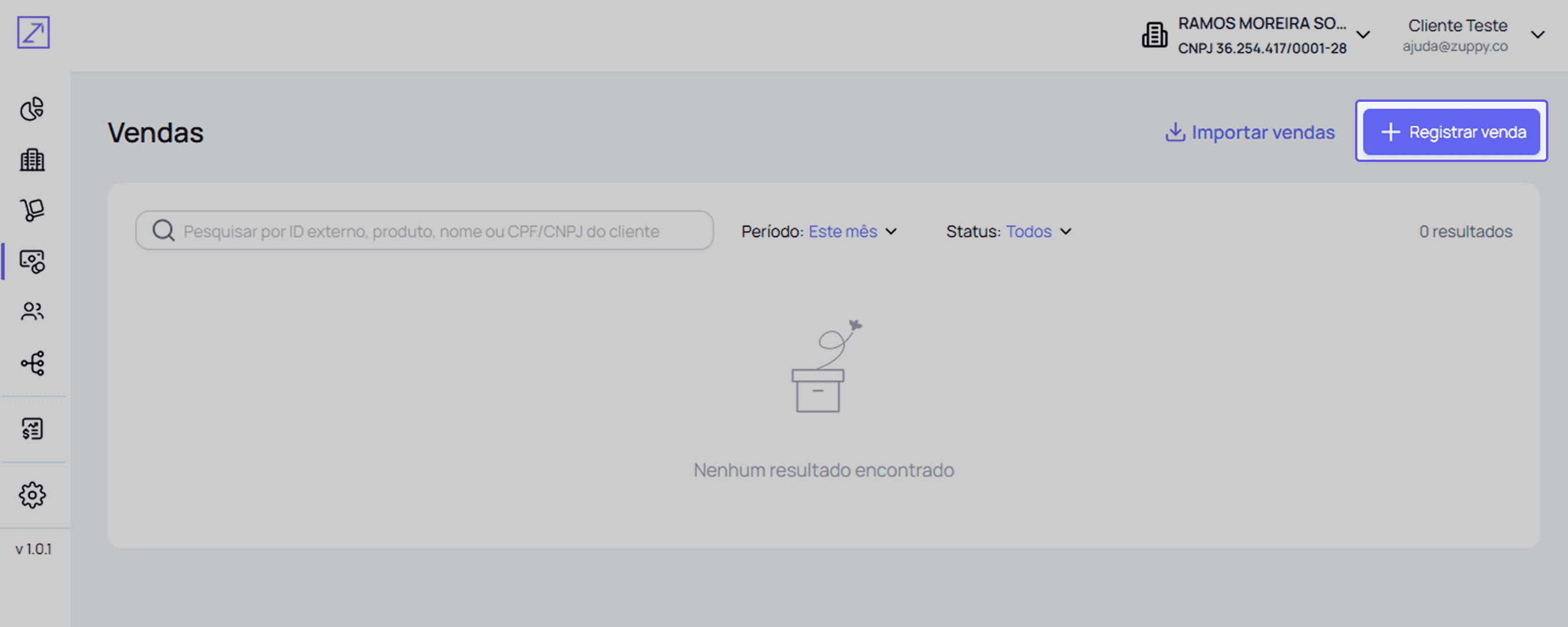Vá até o menu Vendas e registre uma venda manual usando o produto de teste criado.