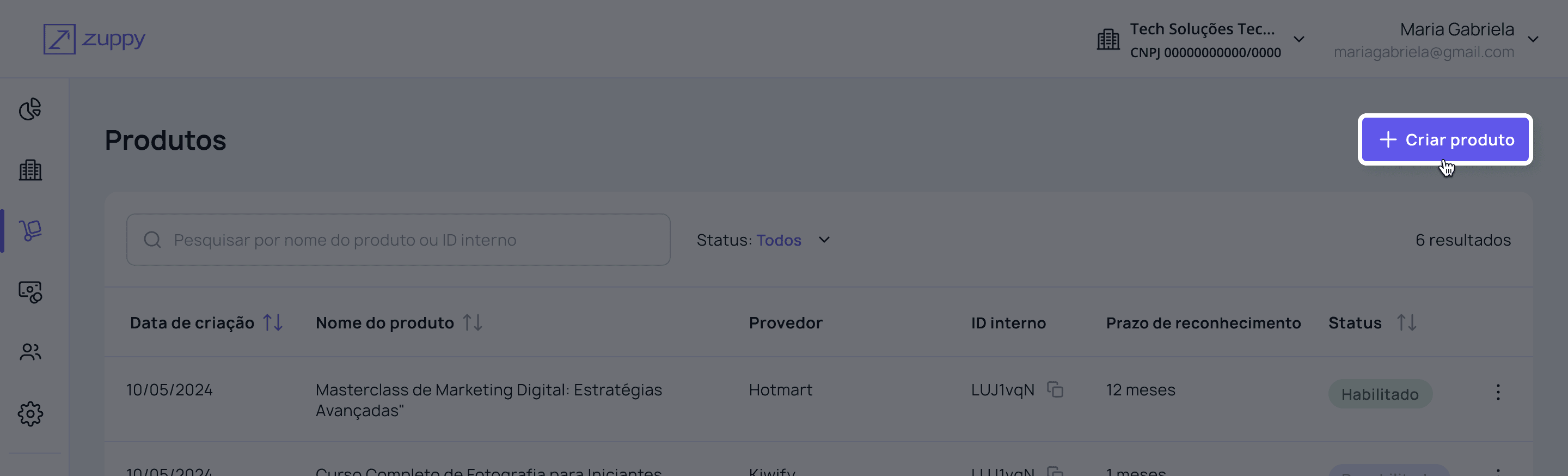 Acesse o menu Produtos e clique em Criar Produto.