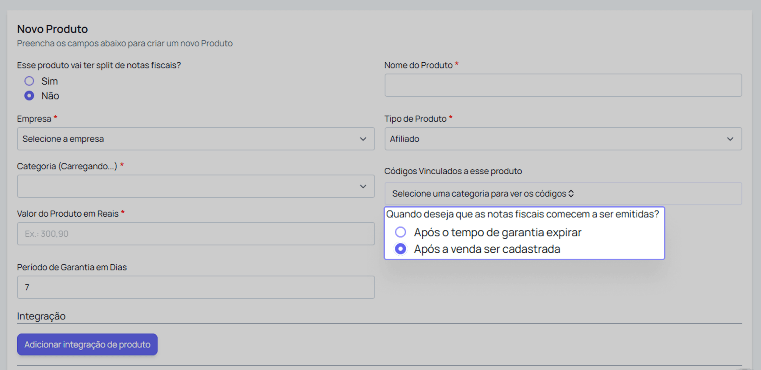 ⚠️ Atenção: na criação do produto, é essencial marcar a opção “Após a venda ser cadastrada”.