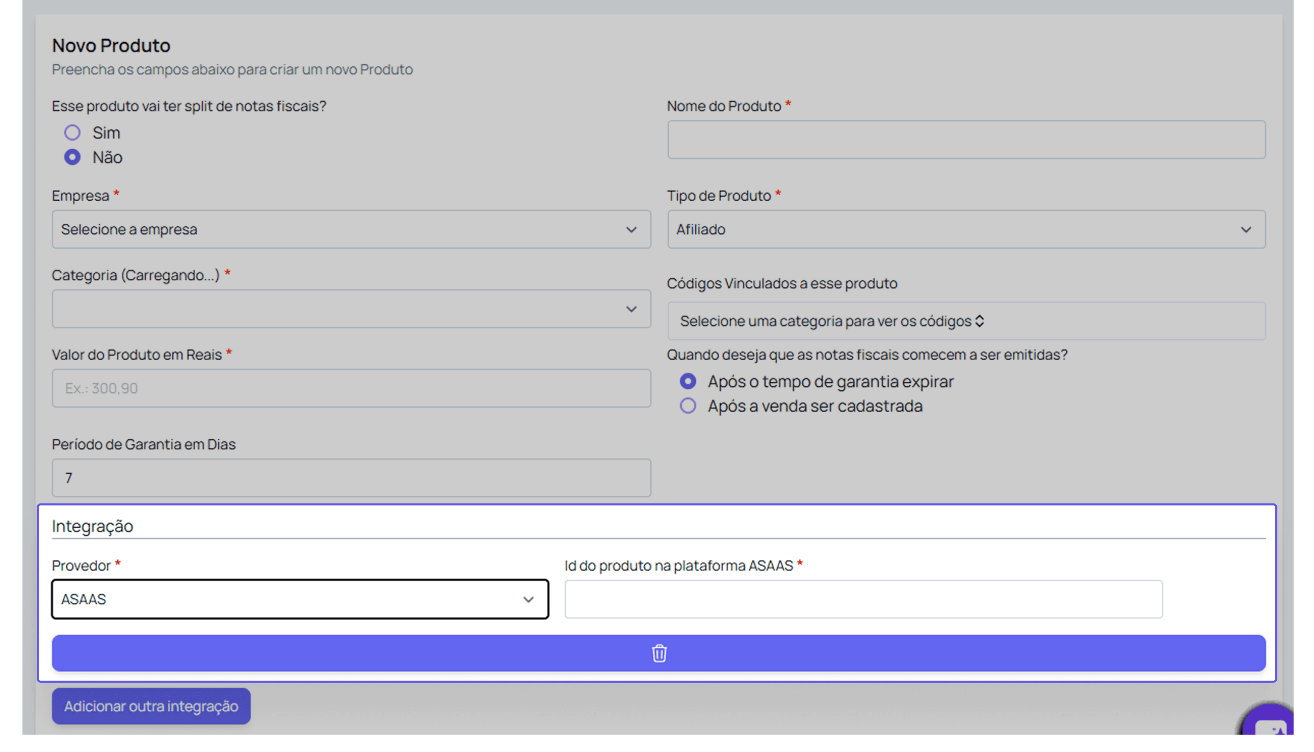 🔍 Certifique-se de que o produto já está com o ID da sua plataforma de vendas configurado e a plataforma integrada à sua empresa.
