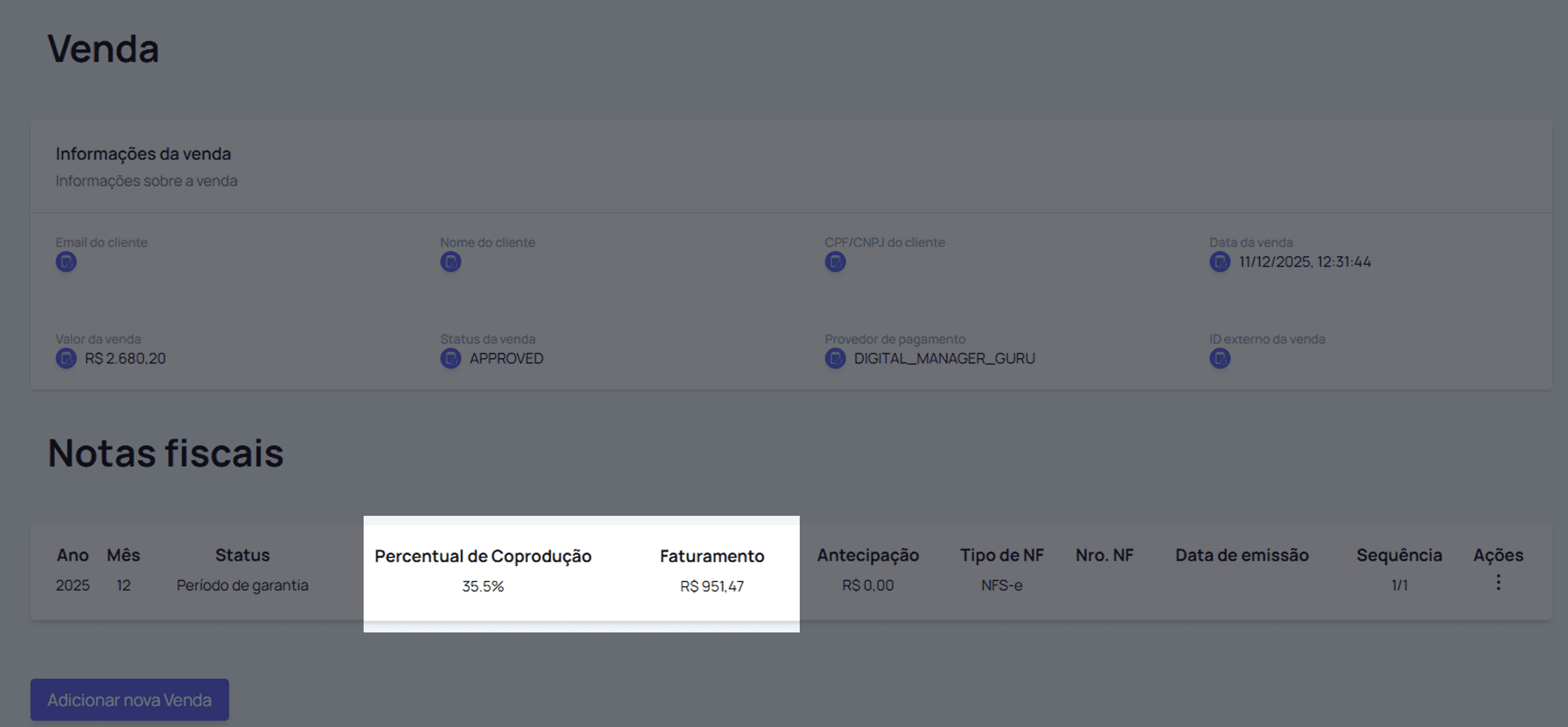 Quando uma venda é realizada, a Zuppy identifica automaticamente os coprodutores envolvidos e divide a receita conforme os percentuais definidos. No detalhamento de cada venda, é possível conferir o percentual de coprodução, o faturamento correspondente e outros dados relacionados à transação.